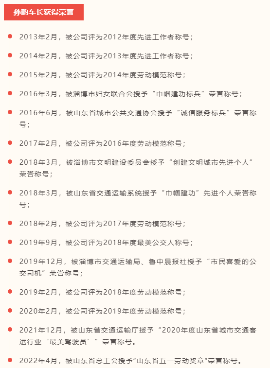 孫韻,女,中共黨員,淄博公交客運(yùn)出租分公司102路線車(chē)長(zhǎng),2011年5月參加工作。先后榮獲市交通運(yùn)輸系統(tǒng)“市民最喜愛(ài)的公交司機(jī)”,省交通運(yùn)輸系統(tǒng)“巾幗建功”先進(jìn)個(gè)人、“最美駕駛員”,2022年4月榮獲“山東省五一勞動(dòng)獎(jiǎng)?wù)?rdquo;。