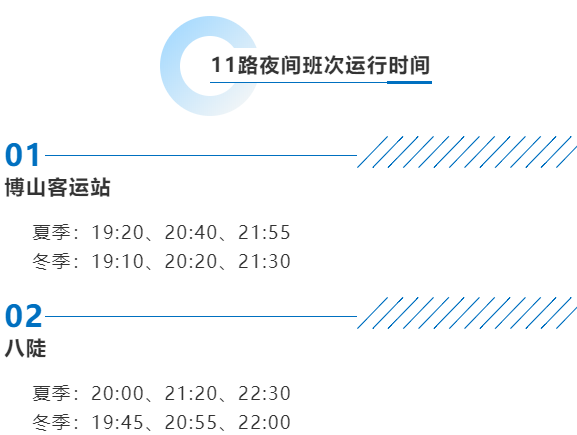 11路公交車途經(jīng)世紀(jì)廣場、火車站、百貨大樓、省陶瓷公司、陶琉大觀園等24個站點,串聯(lián)了博山區(qū)商業(yè)、旅游、住宅及教育文化多個區(qū)域,將搭載市民全方位感受“夜博山”的精彩與繁華。夏季博山客運站末班發(fā)車時間21:55、八陡站22:30,冬季博山客運站末班發(fā)車時間21:30、八陡站22:00,共3個發(fā)班次。