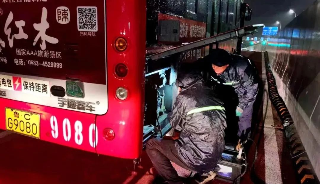 淄博火車站南廣場,車輛維修分公司的搶修員正在冷雨中搶修車輛。這輛公交車在駛離南廣場后不久,儀表突然黑屏,車輛無法啟動。搶修員們接到任務(wù)后,立即趕赴現(xiàn)場,經(jīng)過系列檢測,在更換啟動保險后排除了故障。他們目送公交車駛離,雨水打濕了衣服,寒風吹紅了臉。