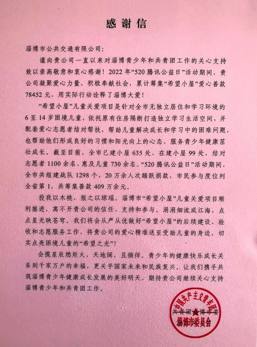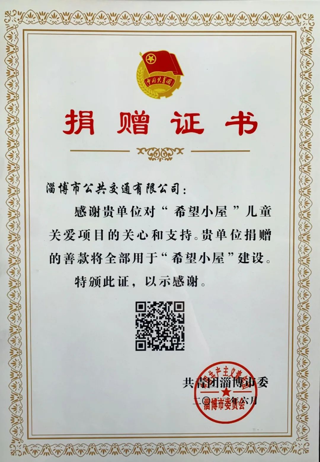 近日,公司收到共青團(tuán)淄博市委發(fā)來的捐贈證書和感謝信,對今年“520騰訊公益日”活動期間,公司捐資支持“希望小屋”項目的善舉,表示肯定和感謝。