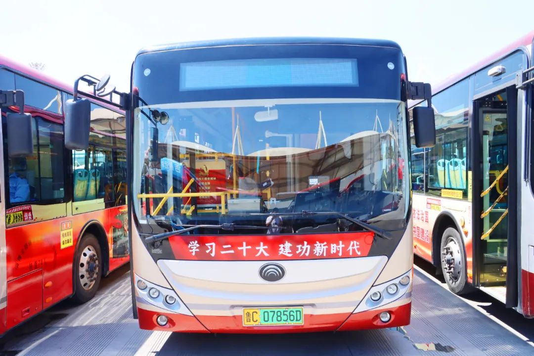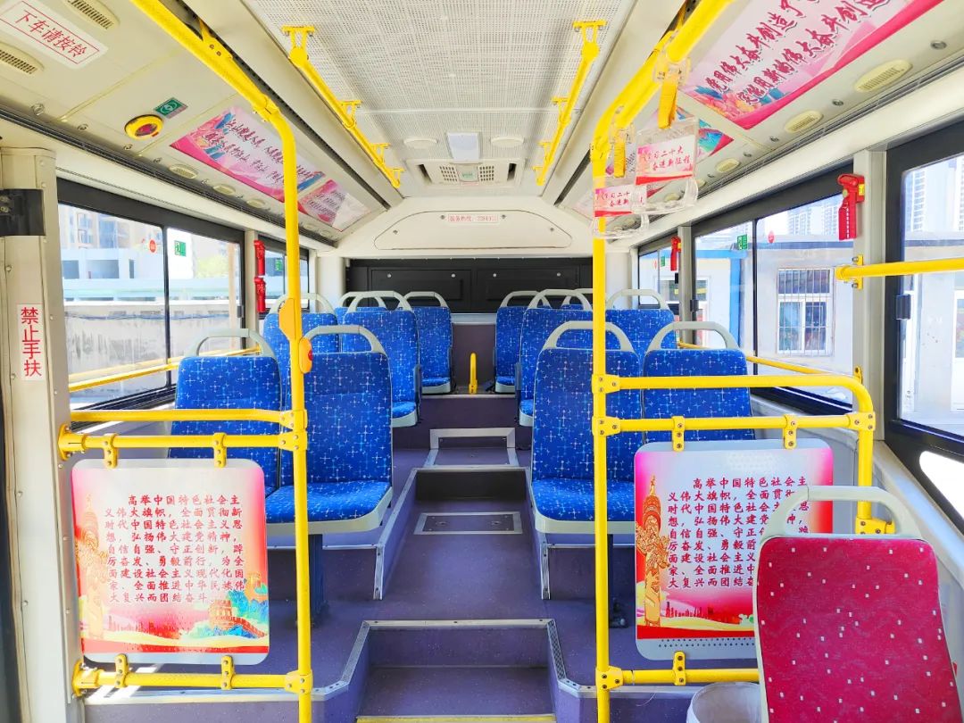 為擴(kuò)大學(xué)習(xí)宣傳效果,淄博公交選取客流量較為密集、途經(jīng)站點(diǎn)較多的121路、136路、138路、263路,將“黨的二十大精神”請上公交車。車廂內(nèi)部以鮮艷的中國紅為主色調(diào),在擋板、燈箱、拉手、靠背等多處設(shè)置宣傳標(biāo)語,通過多角度進(jìn)行打造,乘客上車后即可感受到濃濃的紅色氛圍,目光所及便可接受黨的二十大精神熏陶。