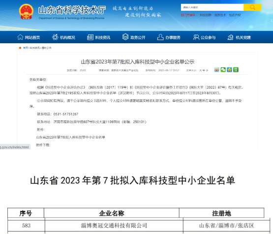 近日,淄博奧冠交通科技有限公司憑借在交通領域的技術創(chuàng)新,被列入2023年第7批“山東省科技型中小企業(yè)”名單。
