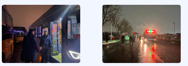 今天上午,降雪不停,城區(qū)路面出現冰雪混合的情況,道路通行條件十分復雜,為了克服困難,公交人迅速集結,力保市民出行。在公交車上,公交車長打起十二分精神,保持車距、謹慎駕駛;在維修車間,修理工不畏嚴寒鉆進車底維修車輛;在公交站頭,站務員耐心幫扶乘客上下車;在各個場站,管輔人員破冰除雪、細心叮囑。在大雪紛飛的站臺,公交志愿者已把站臺清掃干凈,為防止乘客滑倒,還將防滑墊鋪在了車廂,他身旁的同事也忙著在路上撒鹽,過往行人紛紛點頭稱贊。當然,除了“前線”的公交人,在“幕后”的熱線接線員和智能調度員耐心回應乘客咨詢,合理調配車輛運行,也都為應對風雪,服務市民出行貢獻著積極力量。