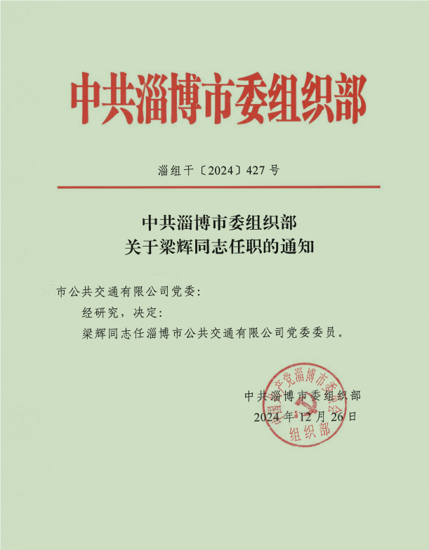 中共市委組織部關(guān)于梁輝同志任職的通知